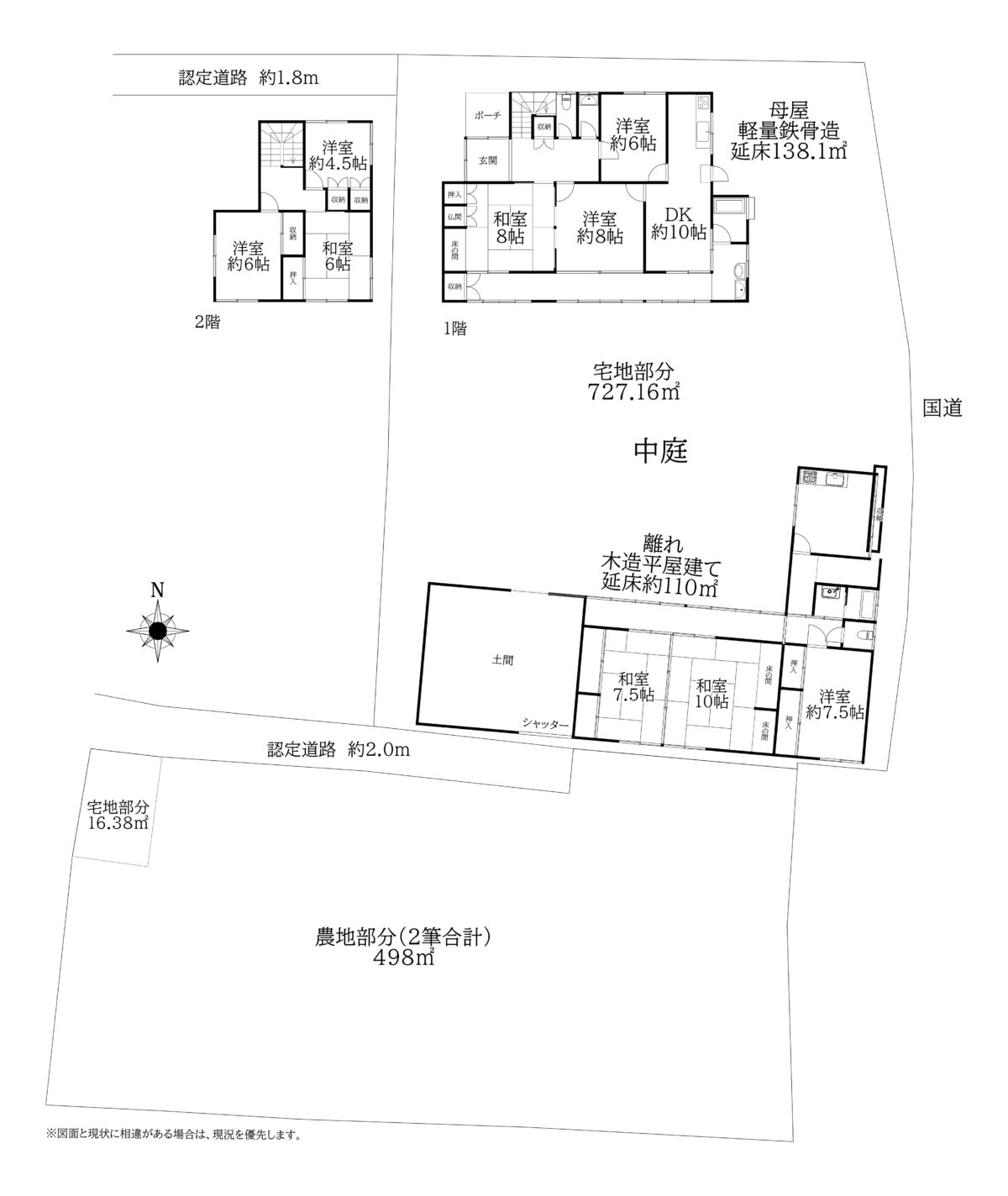 ・境界標含め現状有姿引渡 ・市街化調整区域に位置する為、原則的に再建築等不可。 ただし所轄行政庁との協議/許可のうえ、再建築ができる可能性 有。 ・上記土地面積には農地部分:498㎡含みます。 農地部分には農地法の許可を要します。 ・敷地内に井戸及び浄化槽が残存している可能性がございます。 ・母屋一部未登記+敷地内 未登記建物ございます。